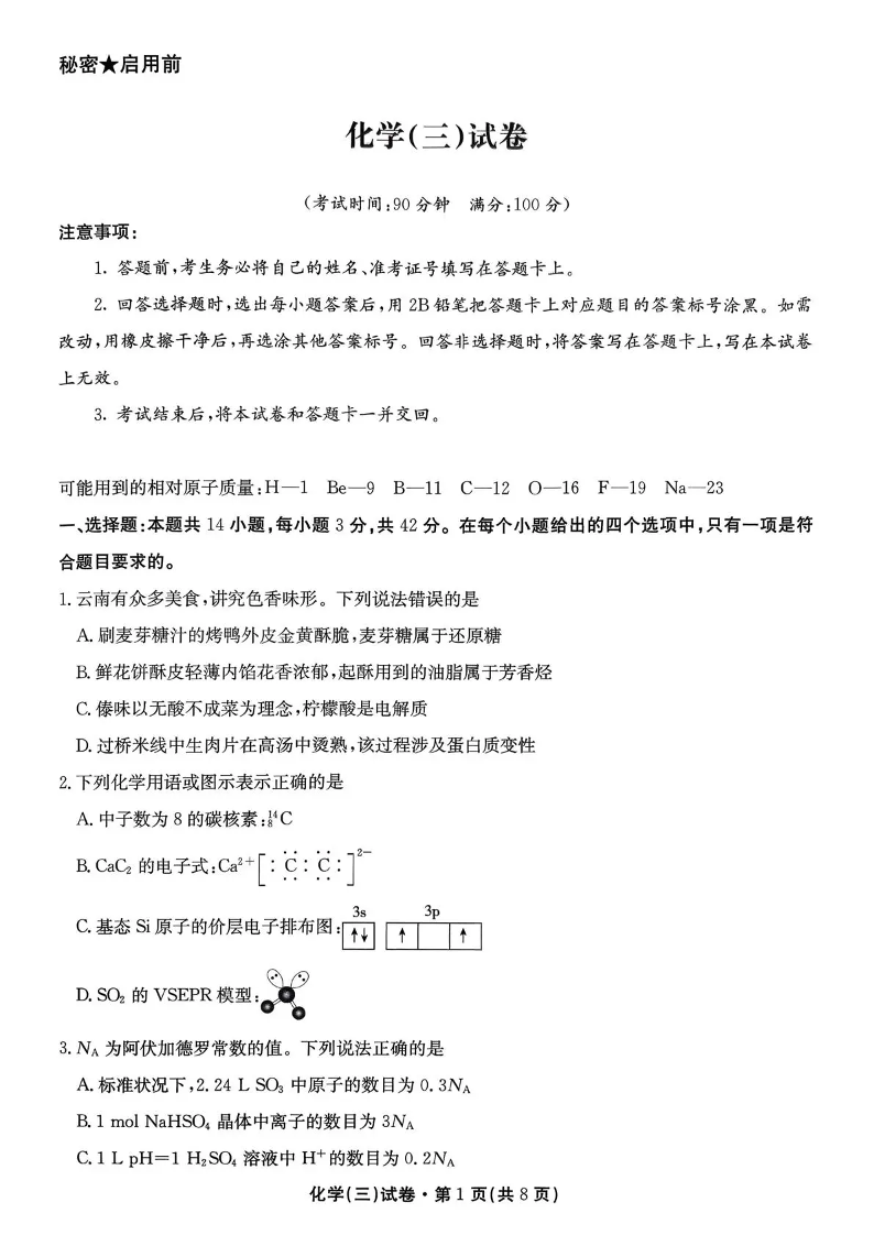高三化学--云南省名校联盟2026届高三上学期第三次联考