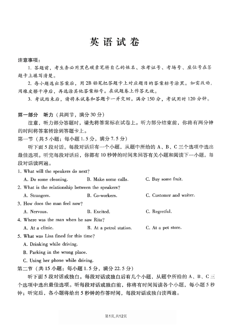 高三英语--重庆市巴蜀中学2026届高考适应性月考卷(五)
