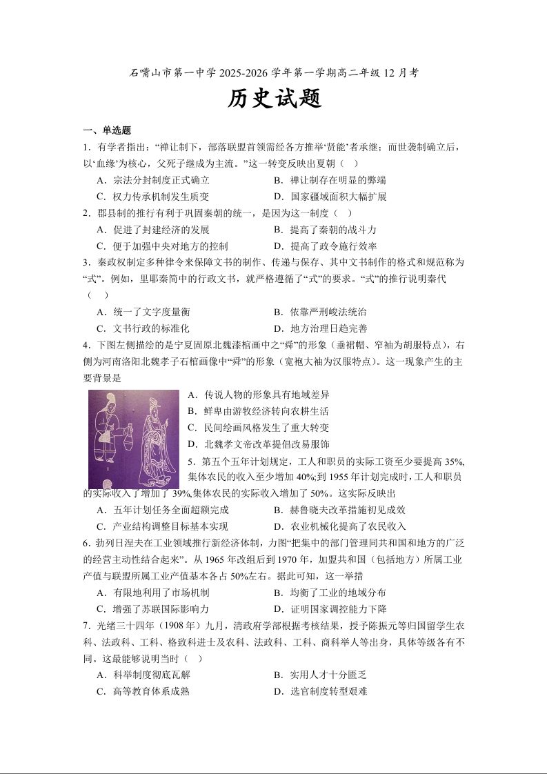高二历史--宁夏回族自治区石嘴山市第一中学2025-2026学年高二上学期12月月考