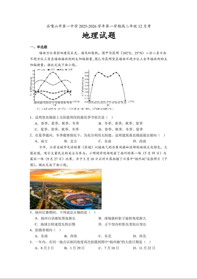 高二地理--宁夏回族自治区石嘴山市第一中学2025-2026学年高二上学期12月月考