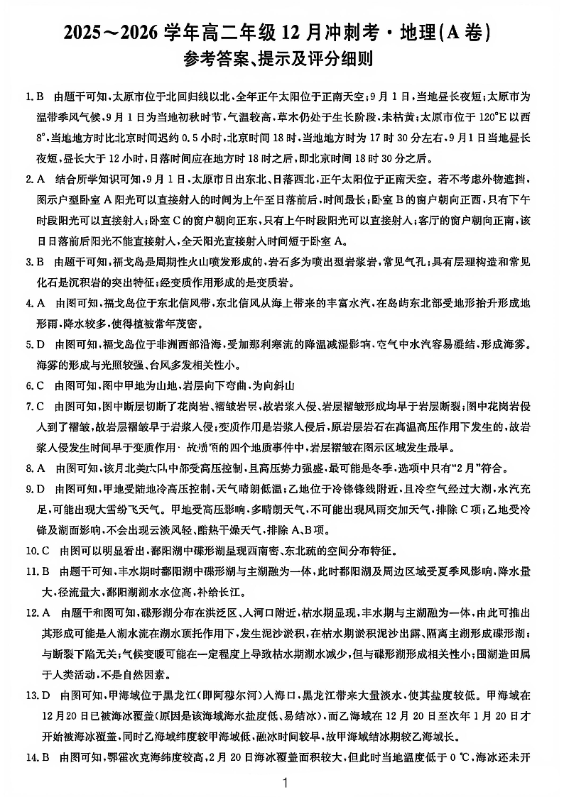 高二地理答案--山西省三晋卓越联盟2025-2026学年高二12月冲刺卷