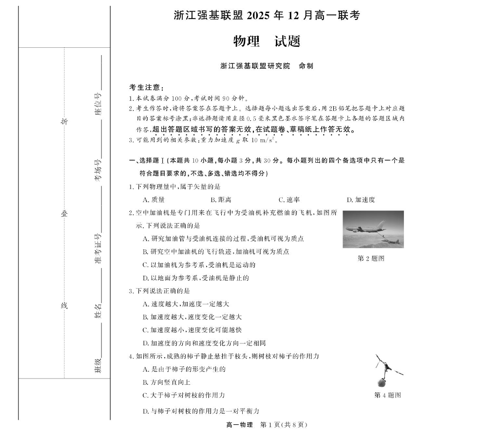 高一物理--浙江省强基联盟2025-2026学年高一上学期12月月考