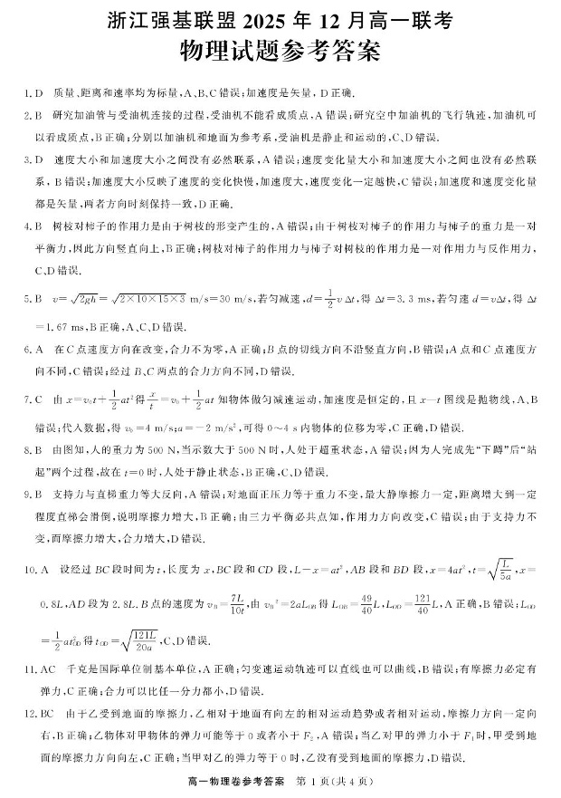 高一物理答案--浙江省强基联盟2025-2026学年高一上学期12月月考