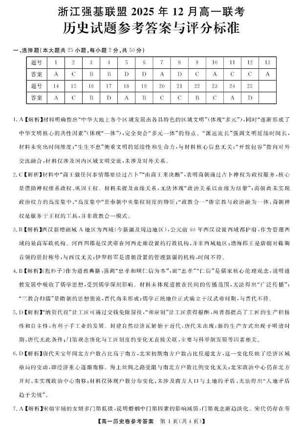 高一历史答案--浙江省强基联盟2025-2026学年高一上学期12月月考