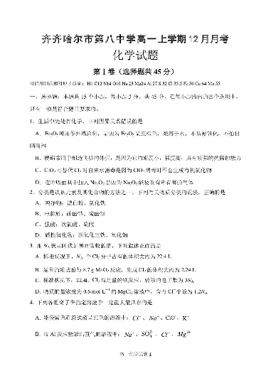 高一化学+答案--黑龙江省齐齐哈尔市第八中学校2025-2026学年高一上学期12月月考