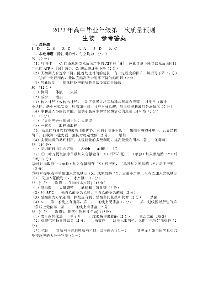 高三生物答案--河南省郑州市2023届高三第三次质量预测