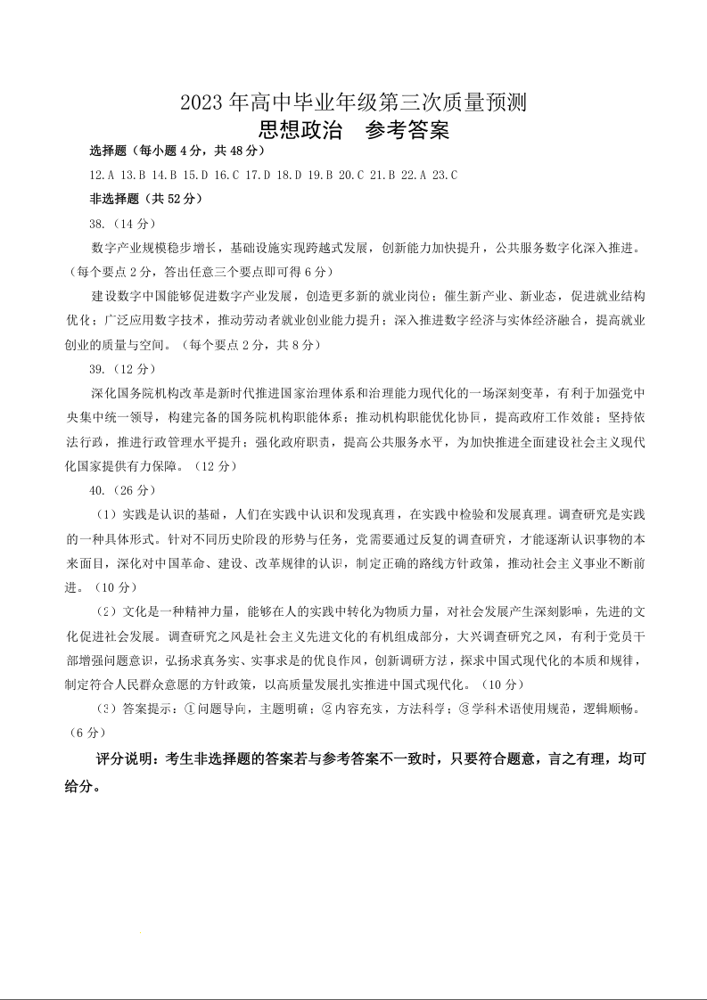 高三政治答案--河南省郑州市2023届高三第三次质量预测