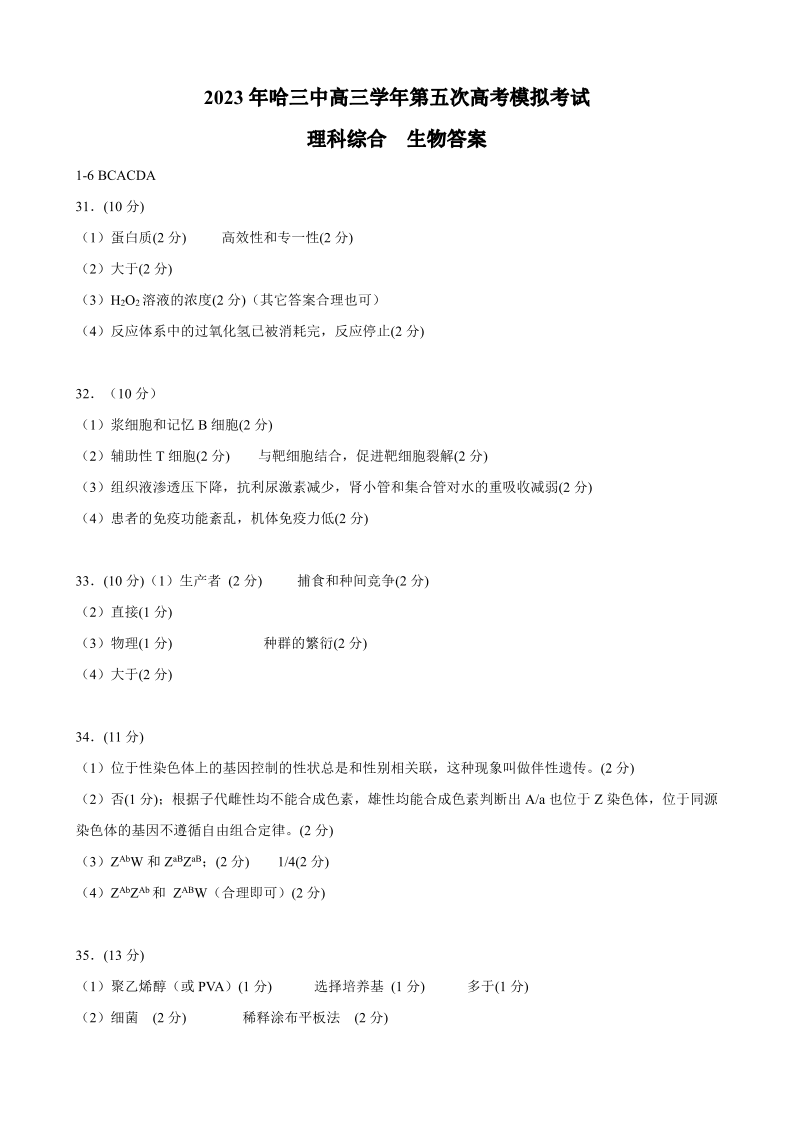 高三生物答案--黑龙江省哈尔滨市第三中学校2023届高三第五次模拟考试