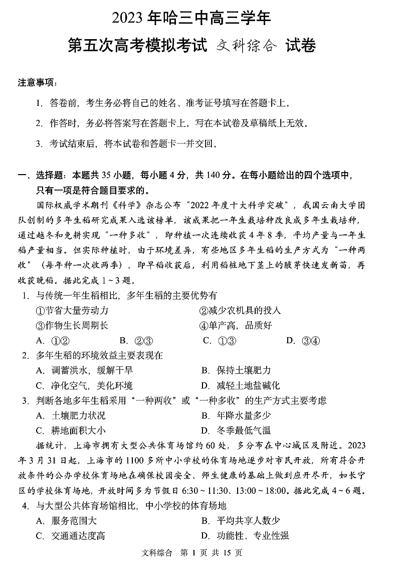 高三文综--黑龙江省哈尔滨市第三中学校2023届高三第五次模拟考试