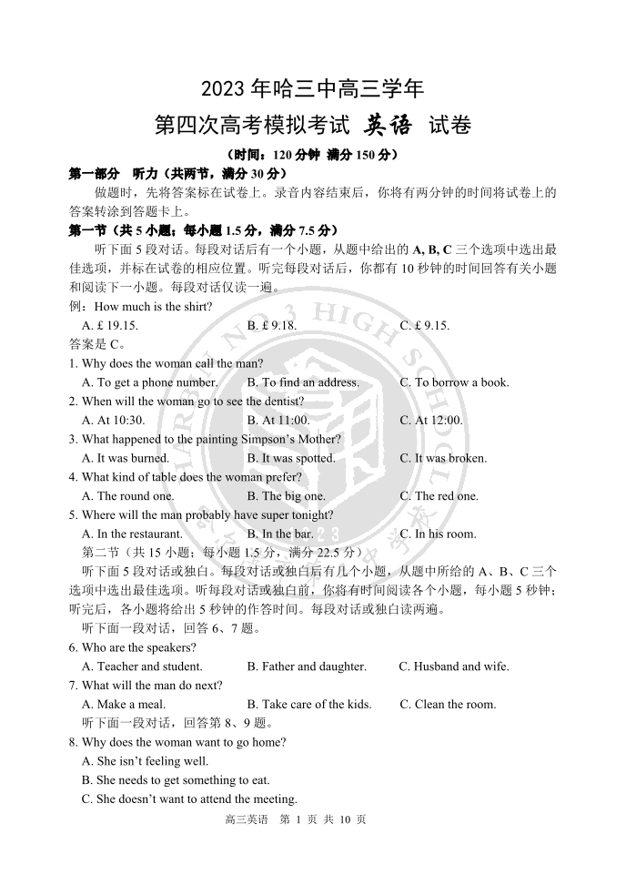 高三英语--黑龙江省哈尔滨市第三中学校2023届高三四模