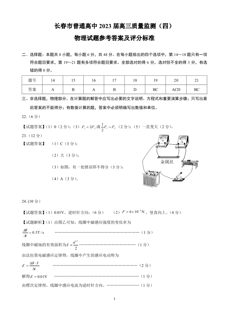 高三物理答案--吉林省长春市2023届高三质量监测(四)