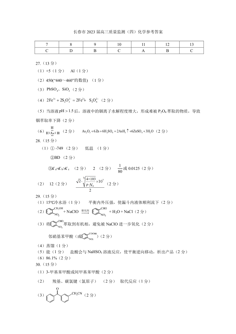 高三化学答案--吉林省长春市2023届高三质量监测(四)