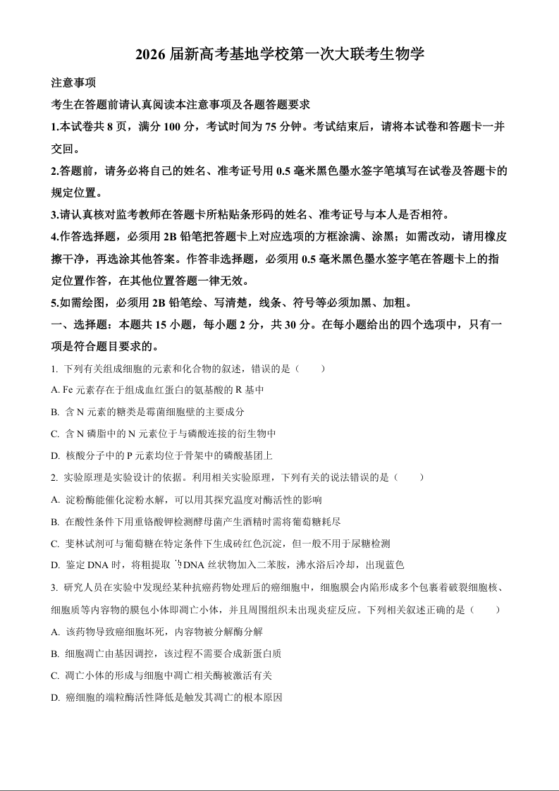 高三生物--江苏省新高考基地学校2026届高三上学期第一次大联考