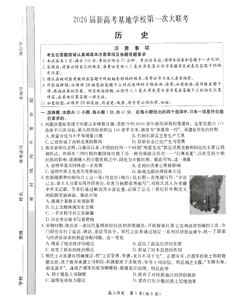 高三历史--江苏省新高考基地学校2026届高三上学期第一次大联考