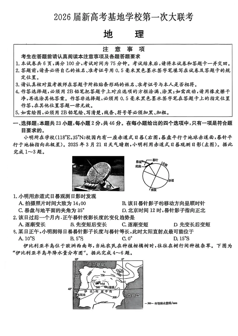 高三地理--江苏省新高考基地学校2026届高三上学期第一次大联考