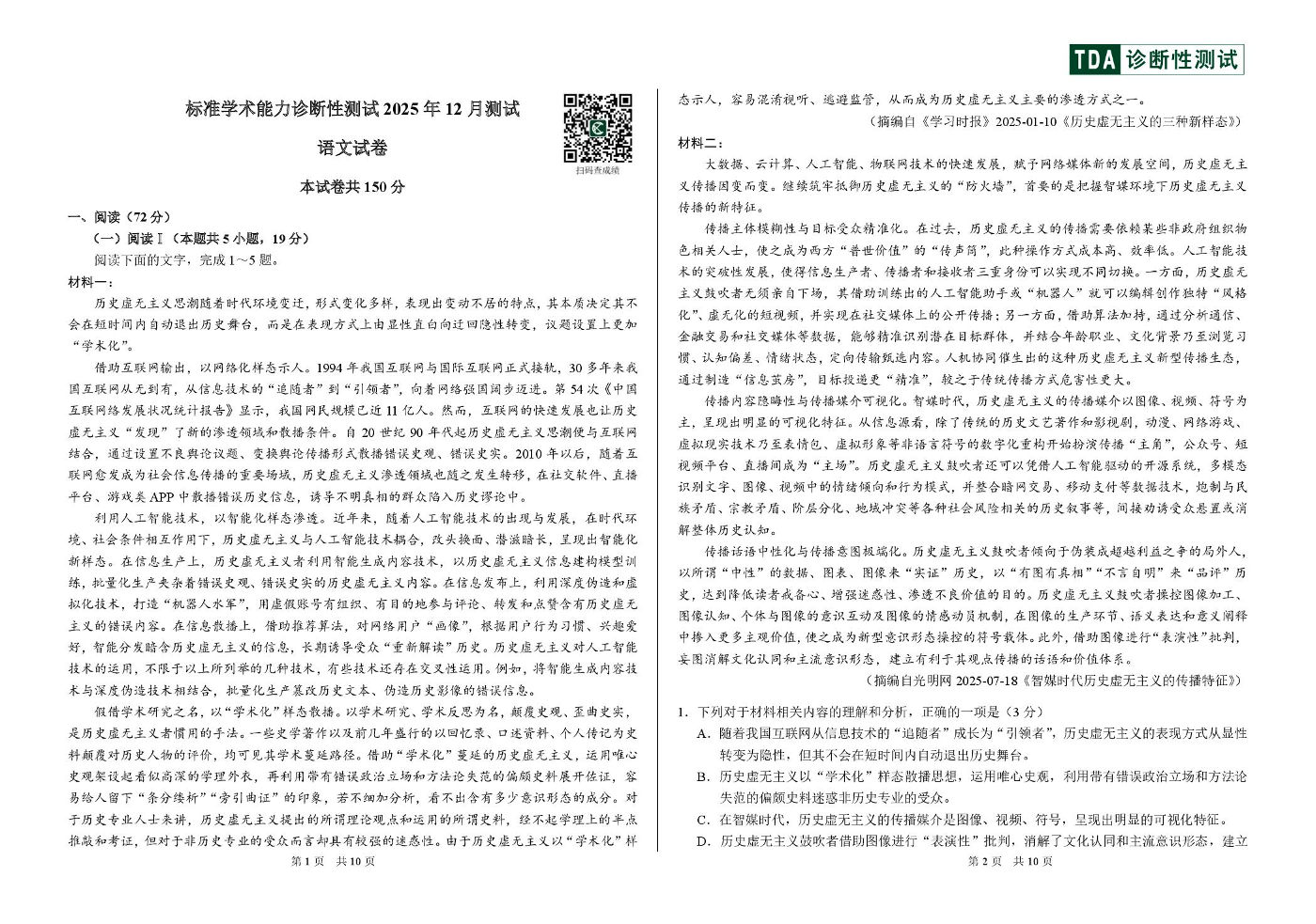 高三语文--中学生标准学术能力(TDA)诊断性测试2026届高三上学期12月测试