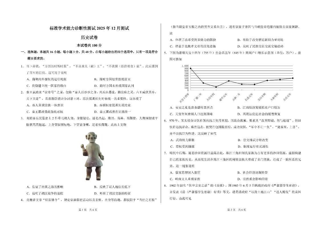 高三历史+答案--中学生标准学术能力(TDA)诊断性测试2026届高三上学期12月测试