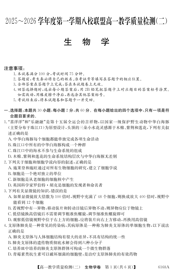 高一生物--广东省纵千文化2025~2026学年度第一学期八校联盟高一教学质量检测(二)