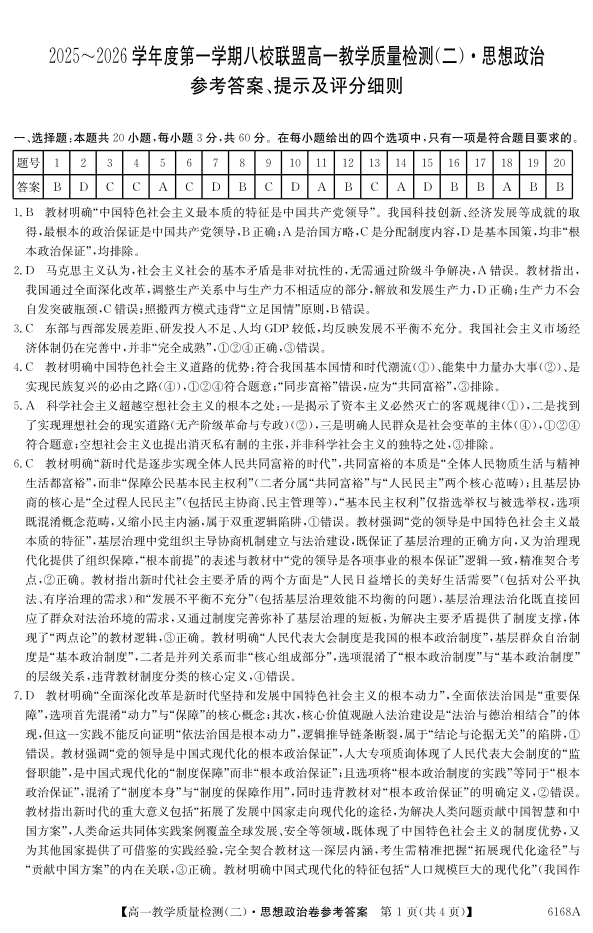 高一政治答案--广东省纵千文化2025~2026学年度第一学期八校联盟高一教学质量检测(二)