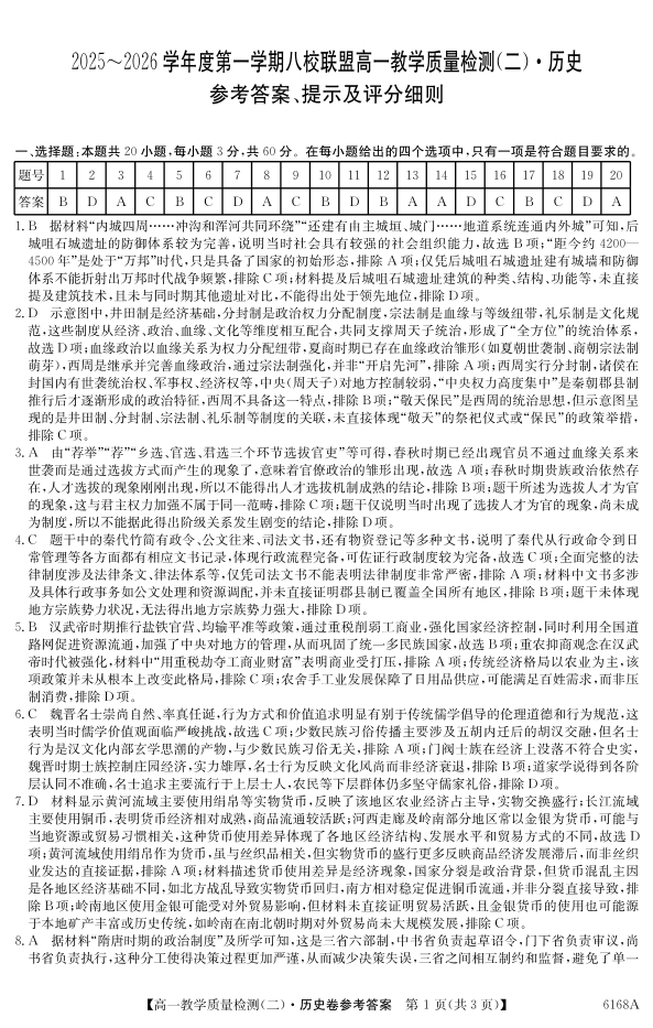 高一历史答案--广东省纵千文化2025~2026学年度第一学期八校联盟高一教学质量检测(二)