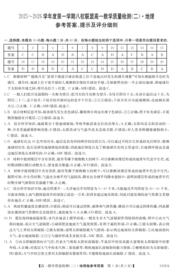 高一地理答案--广东省纵千文化2025~2026学年度第一学期八校联盟高一教学质量检测(二)
