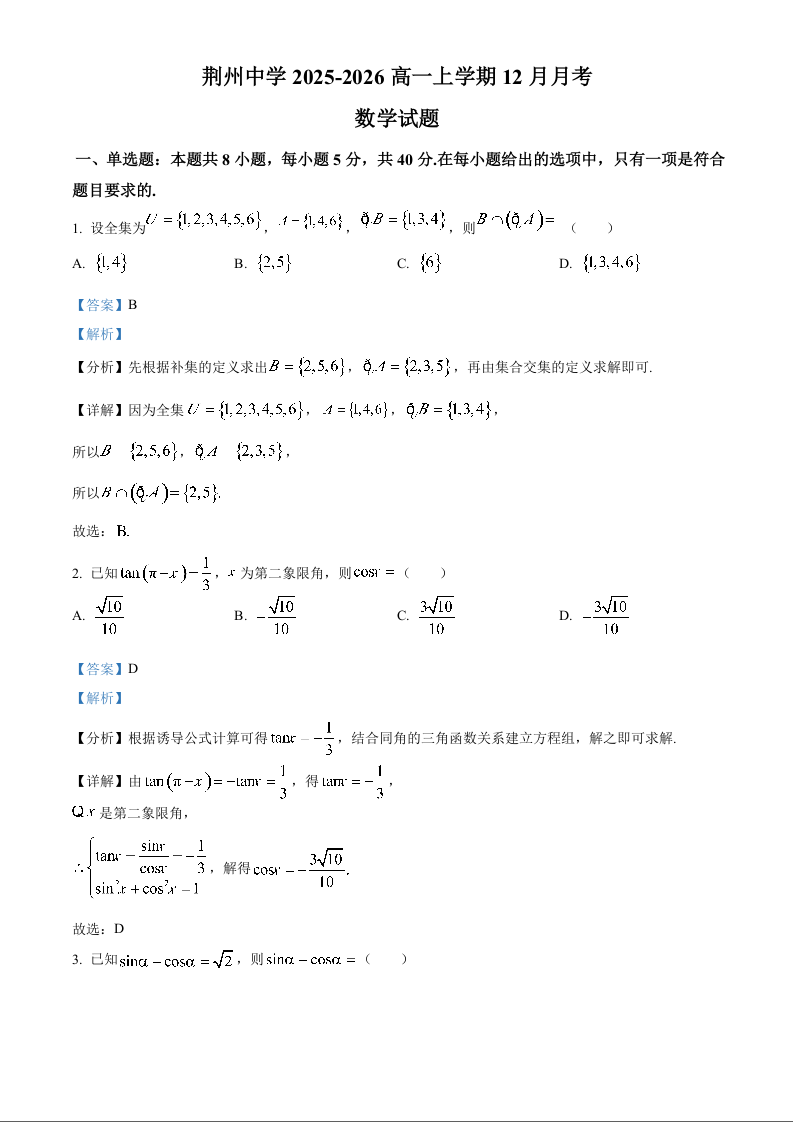 高一数学(解析版)--湖北省荆州市荆州中学2025-2026学年高一上学期12月月考