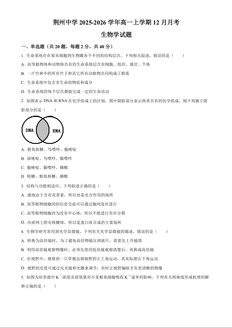 高一生物(原卷版)--湖北省荆州市荆州中学2025-2026学年高一上学期12月月考