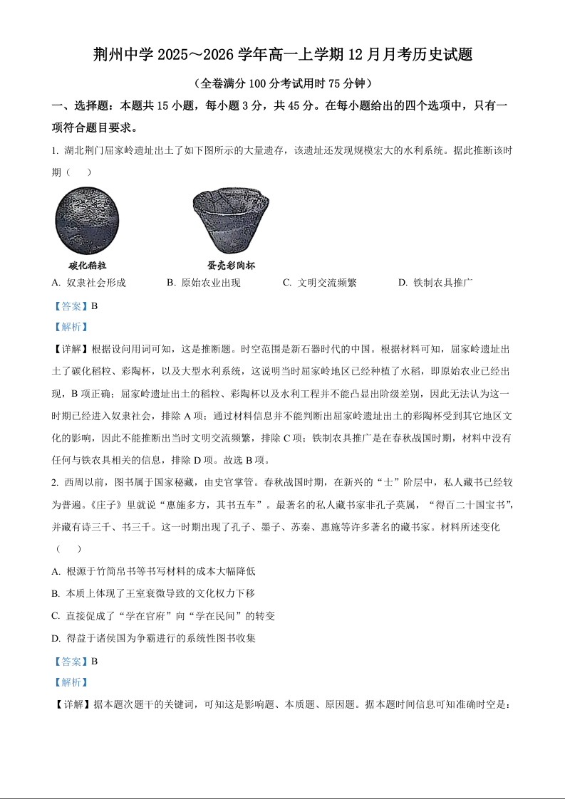 高一历史(解析版)--湖北省荆州市荆州中学2025-2026学年高一上学期12月月考