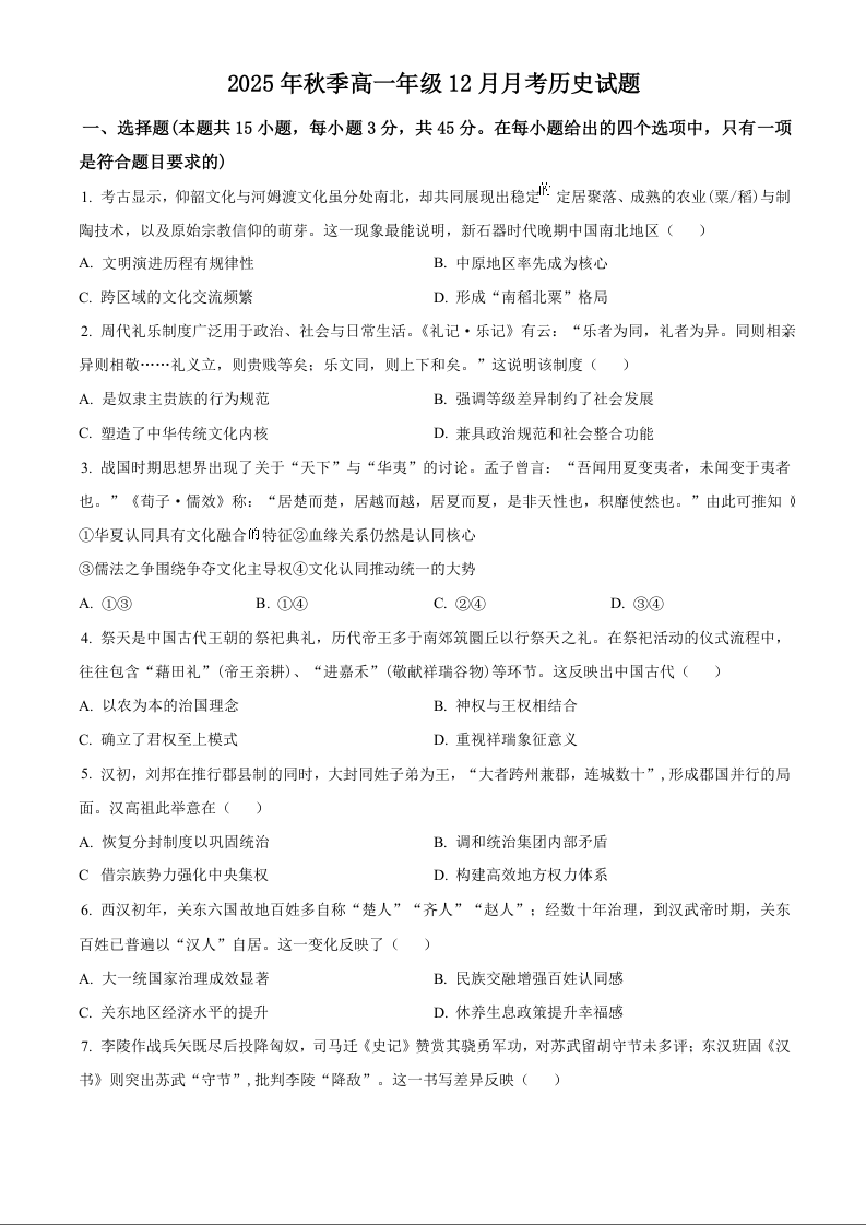 高一历史(原卷版)--湖北省重点高中智学联盟2025-2026学年高一上学期12月月考