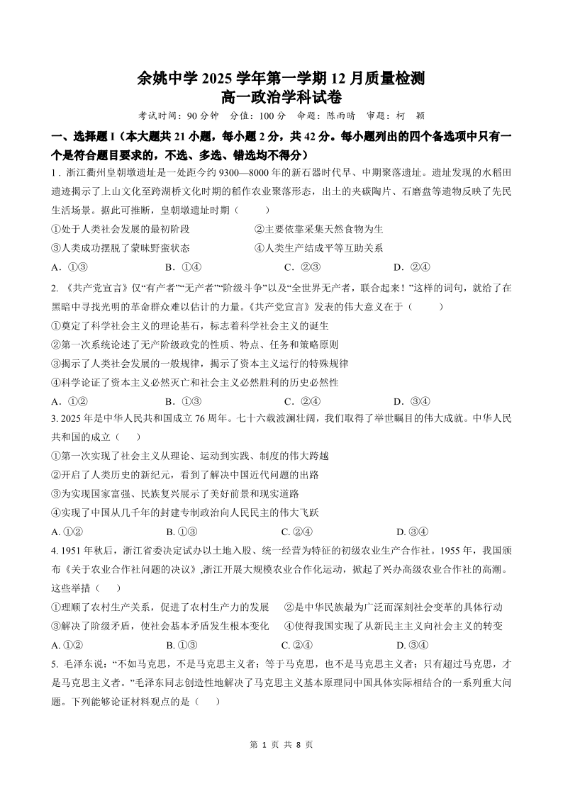 高一政治--浙江省余姚中学2025-2026学年高一上学期12月月考