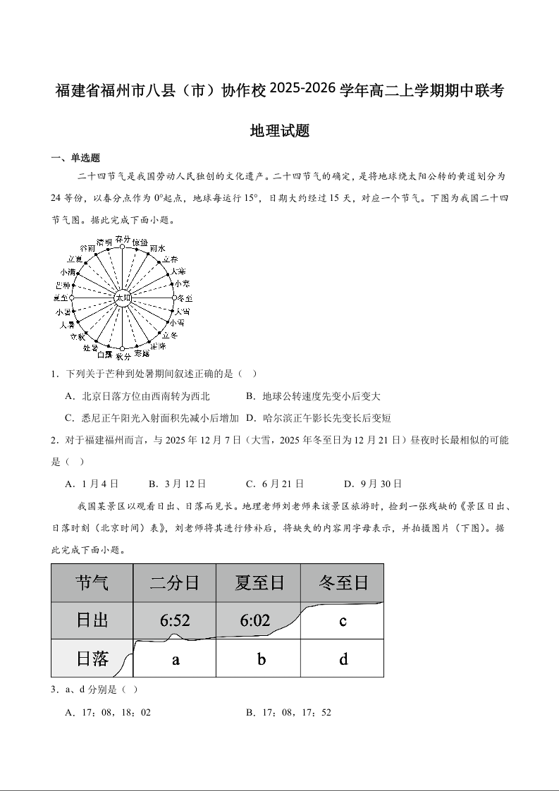 高二地理+答案--福建省福州市八县(市)协作校2025-2026学年高二上学期期中联考