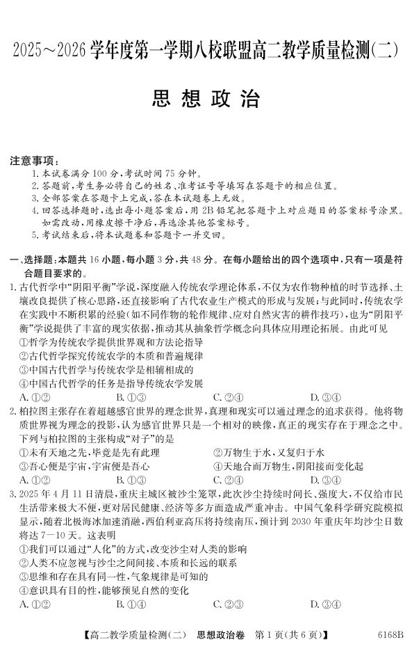 高二政治--广东省纵千文化2025~2026学年度第一学期八校联盟高二教学质量检测(二)
