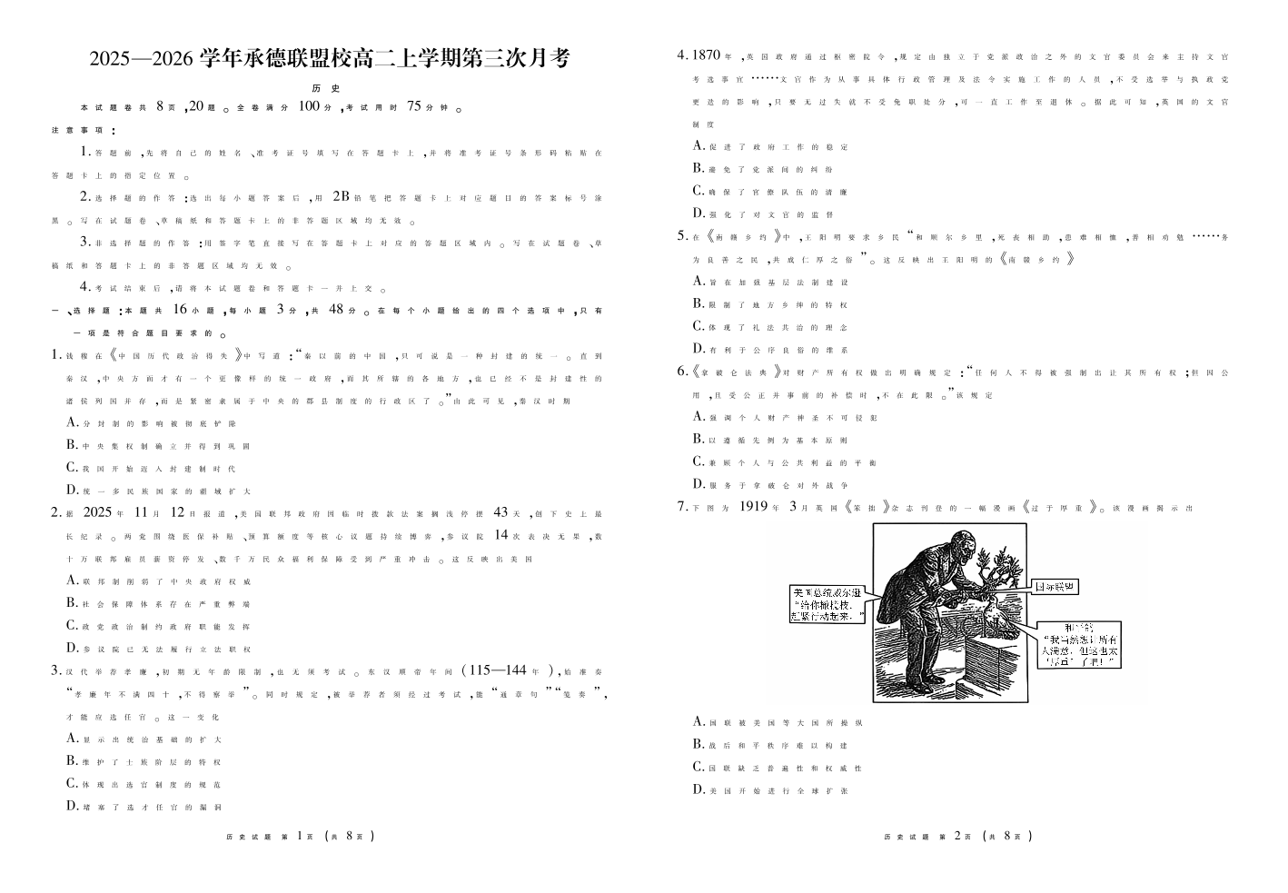 高二历史--河北省衡水金卷2025—2026学年承德联盟校高二上学期第三次月考