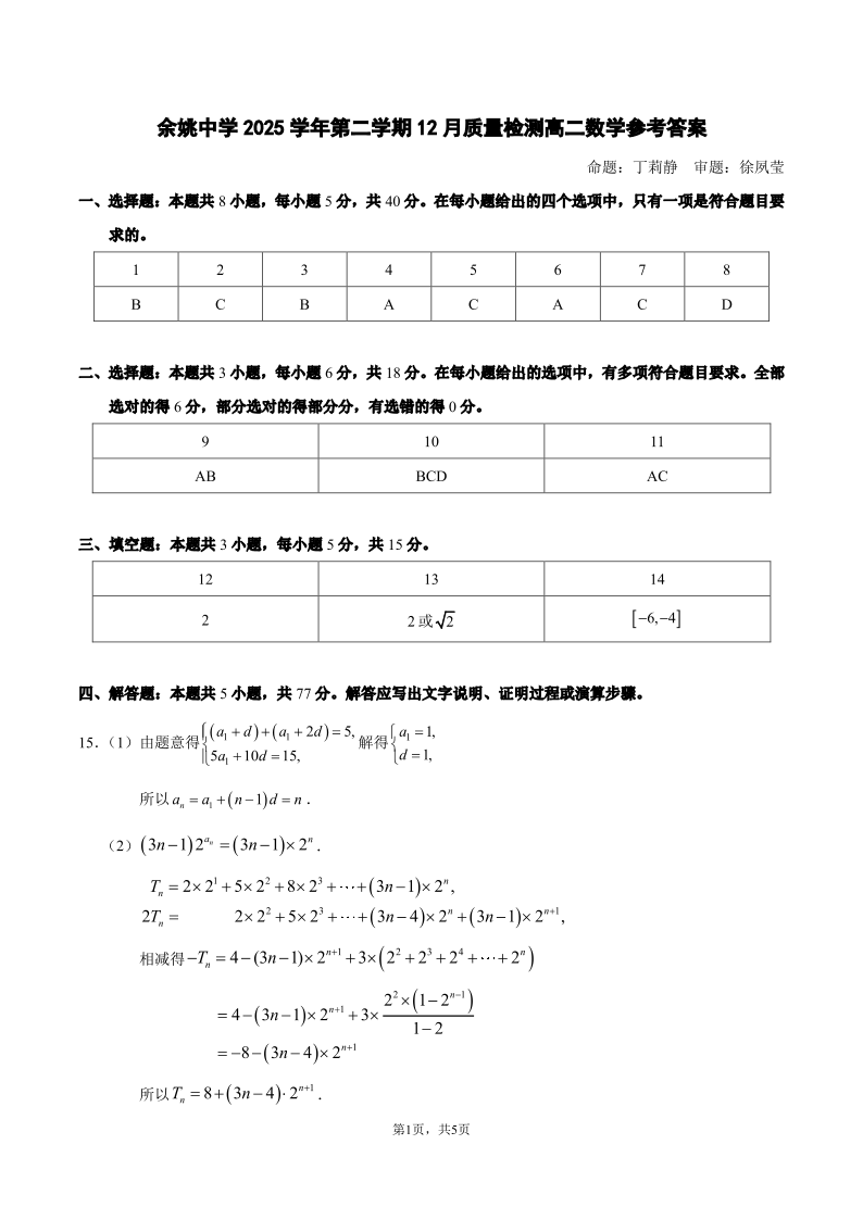 高二数学答案--浙江省余姚中学2025-2026学年高二上学期12月月考