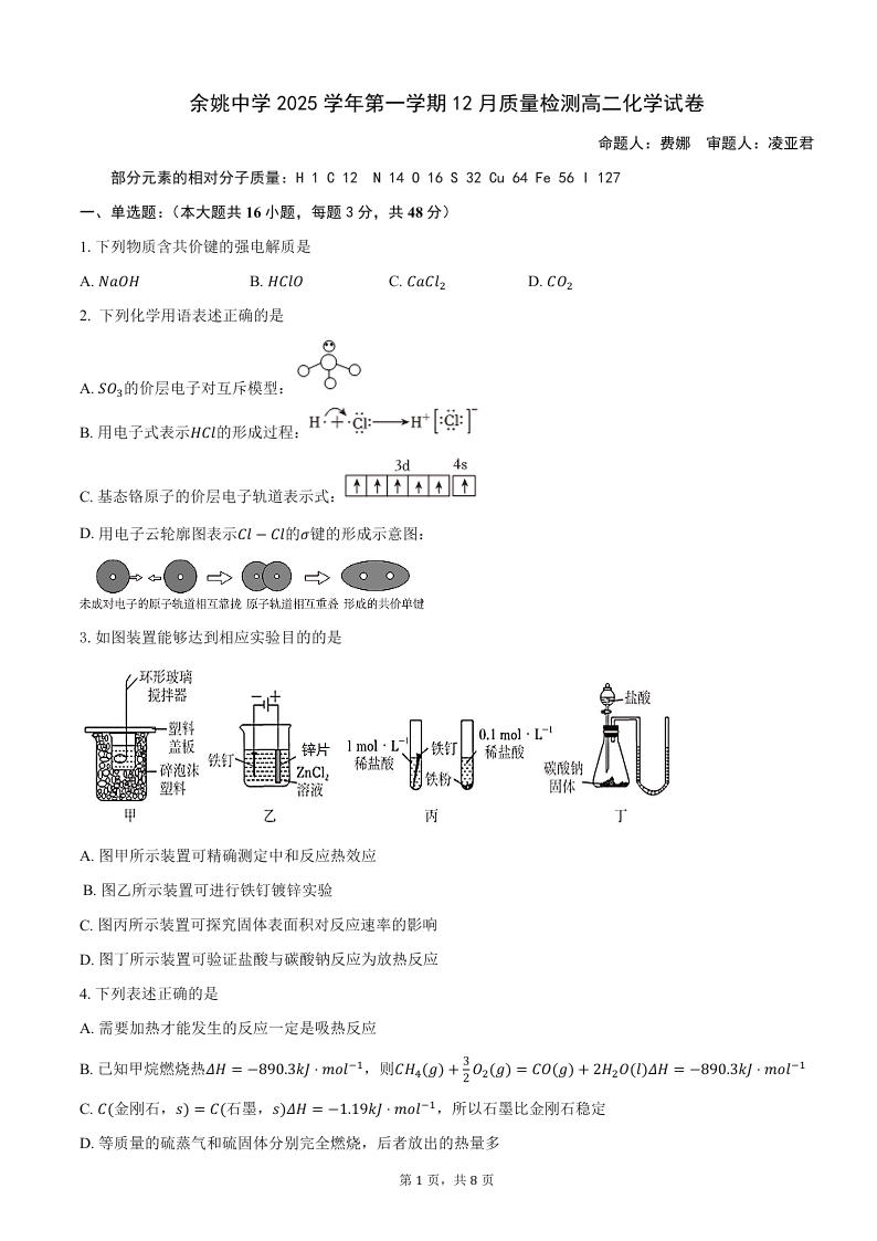 高二化学--浙江省余姚中学2025-2026学年高二上学期12月月考