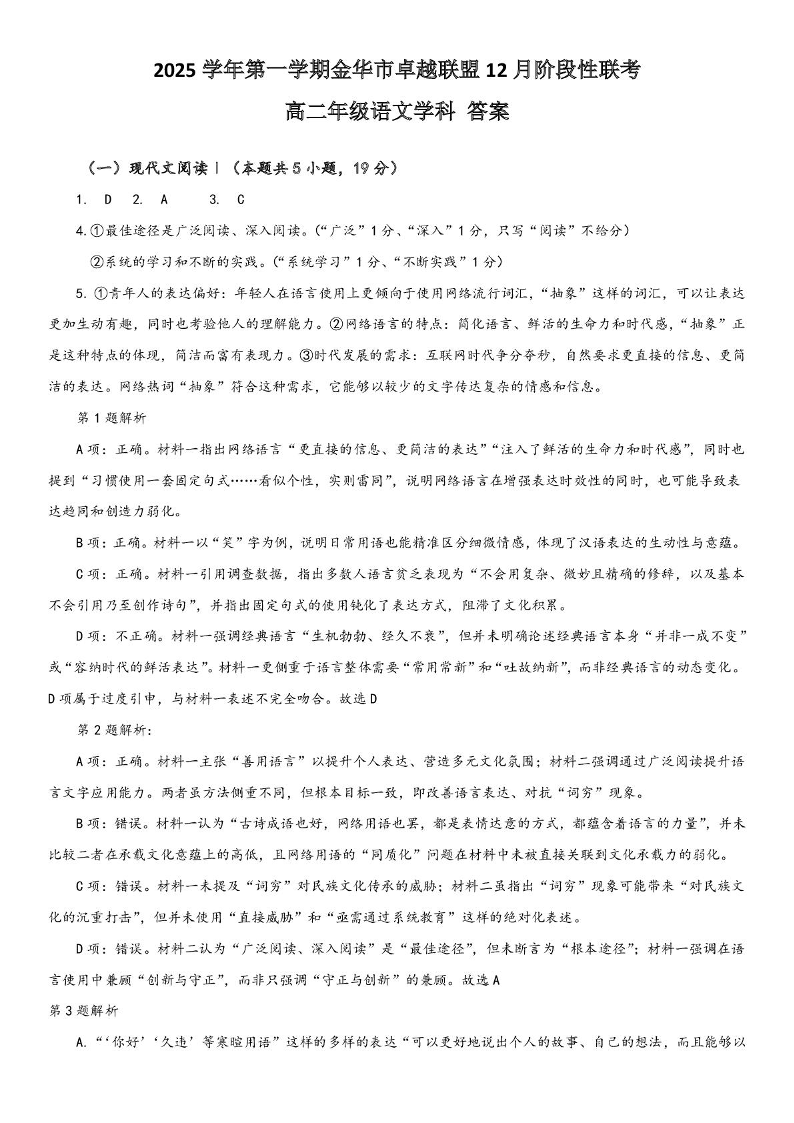 高二语文答案--浙江省金华市卓越联盟2025-2026学年高二上学期12月月考