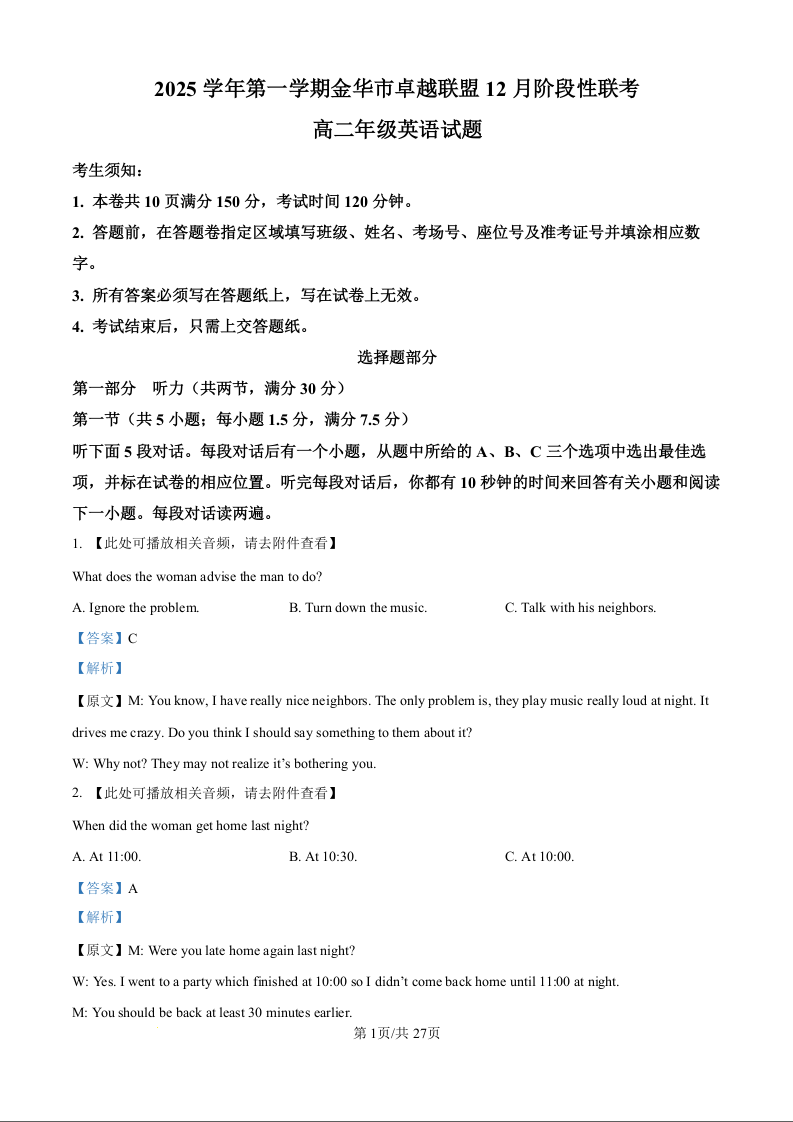高二英语(精品解析版)--浙江省金华市卓越联盟2025-2026学年高二上学期12月月考