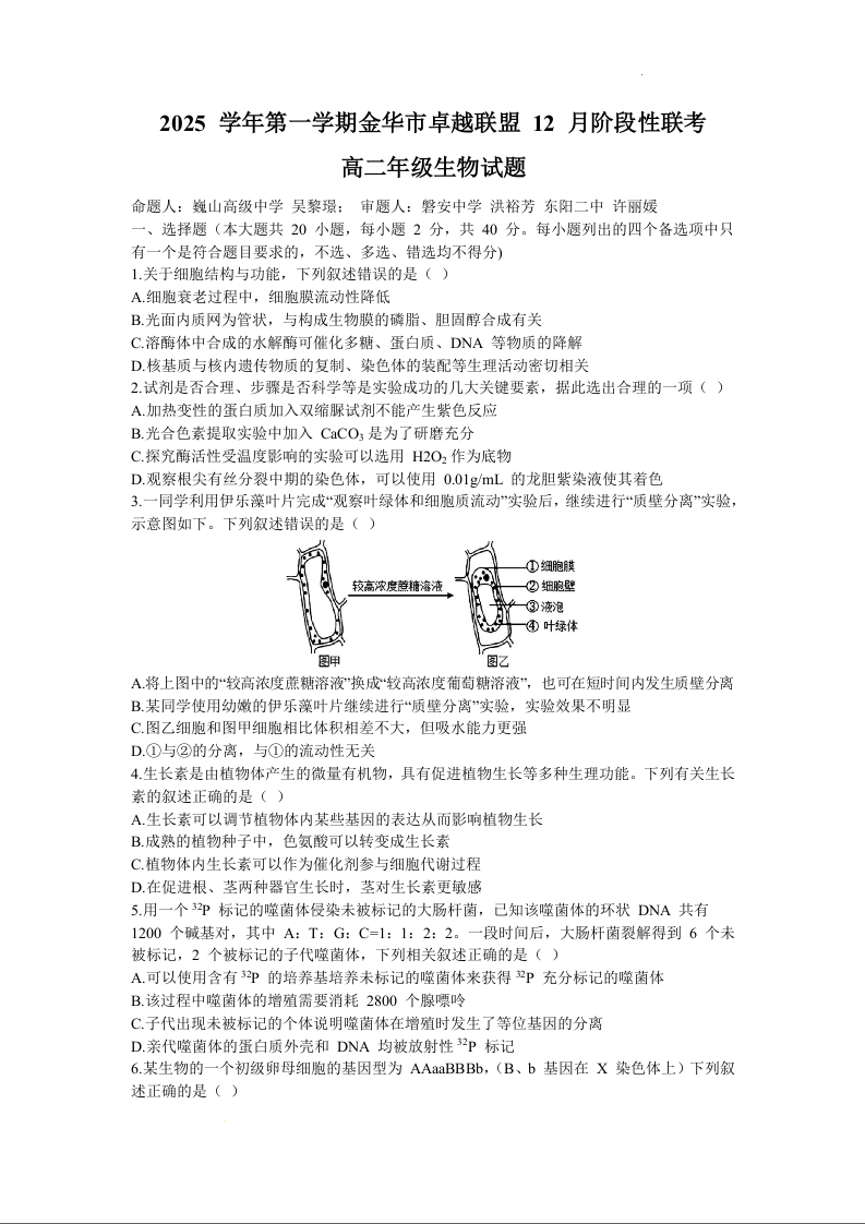 高二生物+答案--浙江省金华市卓越联盟2025-2026学年高二上学期12月月考