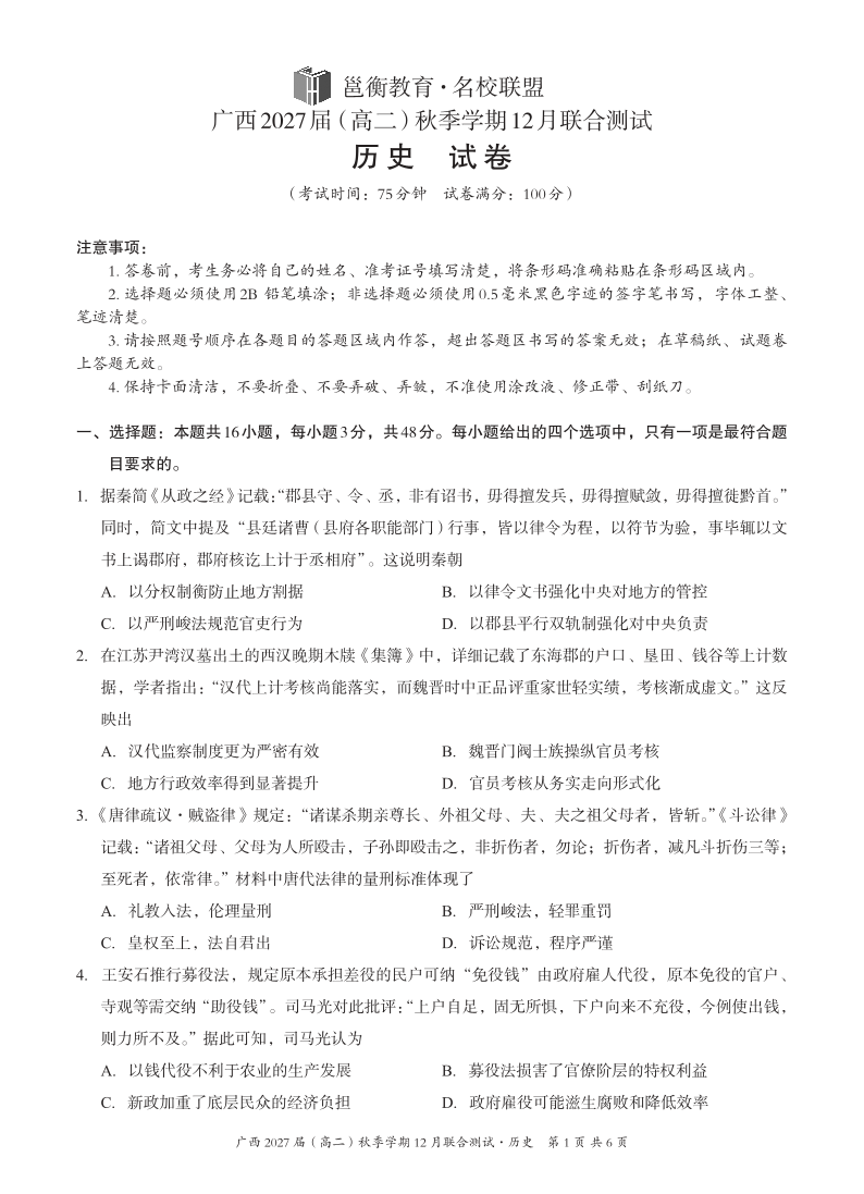高二历史--广西邕衡教育·名校联盟2025-2026学年高二秋季学期12月联合测试