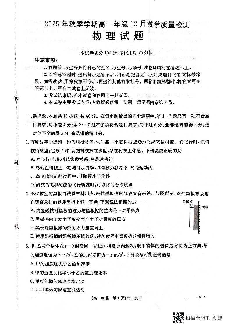 高一物理--广西壮族自治区贵港市、桂林市2025-2026学年高一上学期12月月考