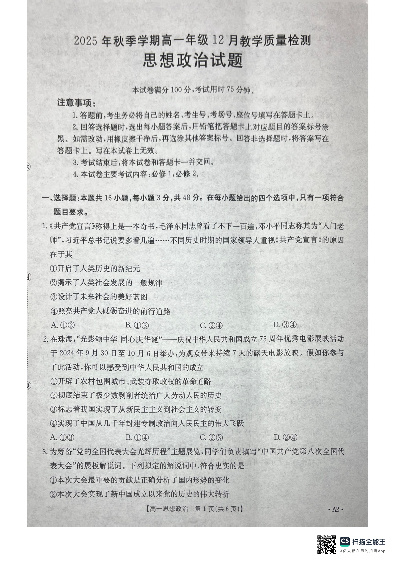 高一政治--广西壮族自治区贵港市、桂林市2025-2026学年高一上学期12月月考