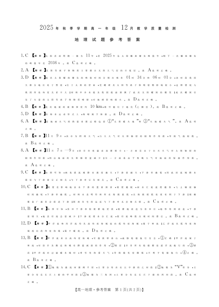高一地理答案--广西壮族自治区贵港市、桂林市2025-2026学年高一上学期12月月考