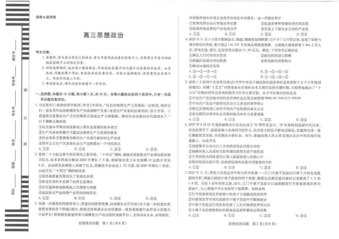 高三政治--湖南省湘一名校联盟2026届高三上学期12月质量检测