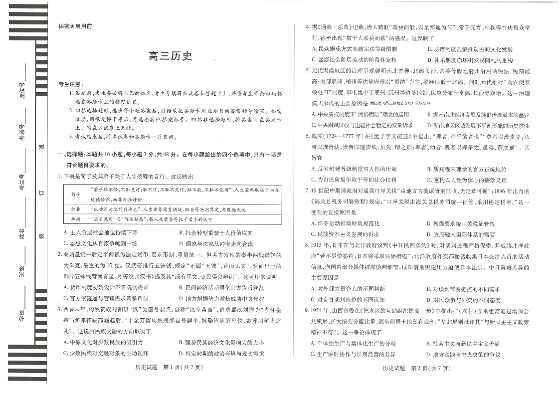 高三历史--湖南省湘一名校联盟2026届高三上学期12月质量检测