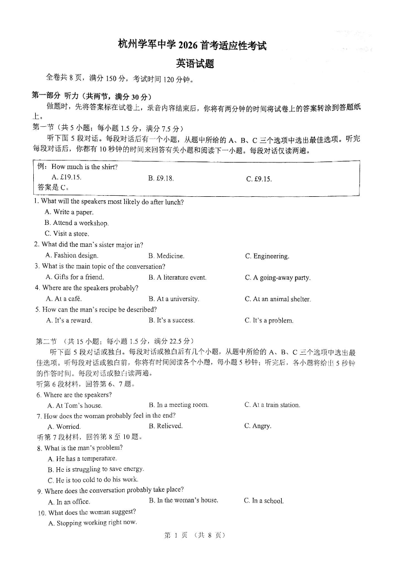 高三英语--浙江省杭州学军中学2026届高三上学期首考适应性考试