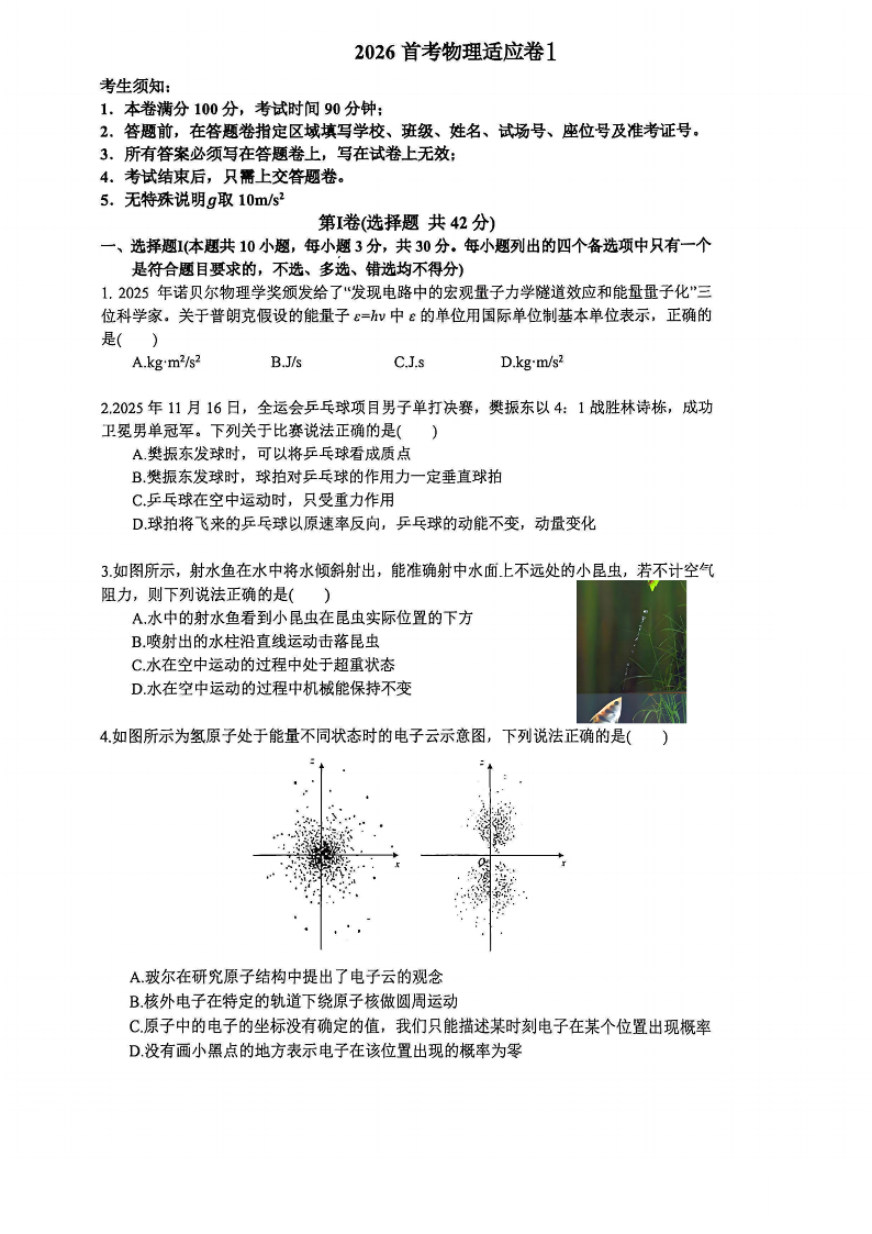 高三物理--浙江省杭州学军中学2026届高三上学期首考适应性考试