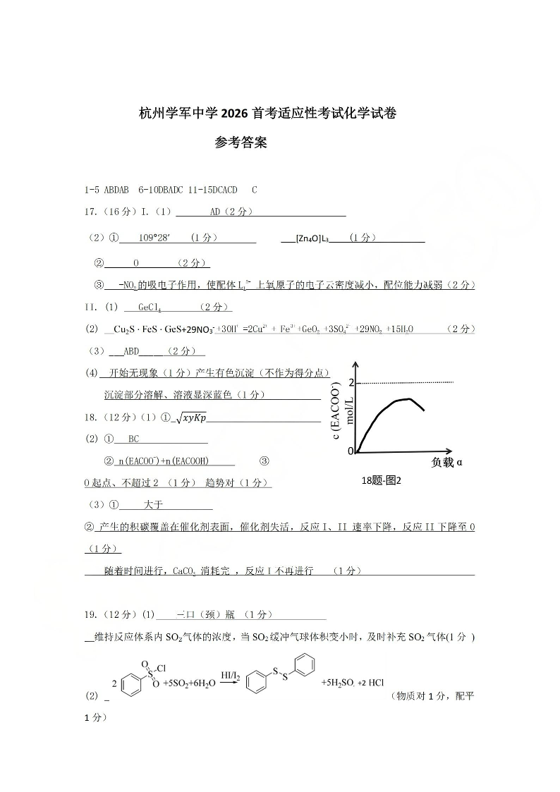 高三化学答案--浙江省杭州学军中学2026届高三上学期首考适应性考试