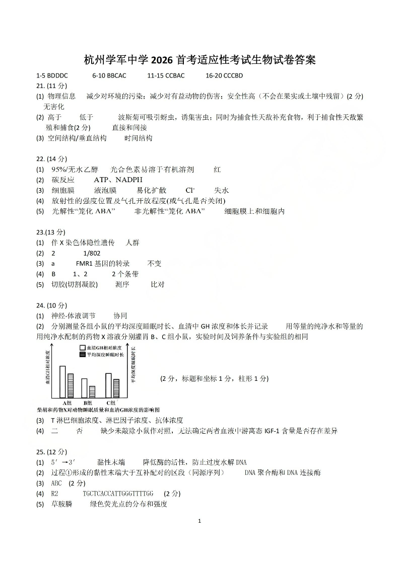 高三生物答案--浙江省杭州学军中学2026届高三上学期首考适应性考试