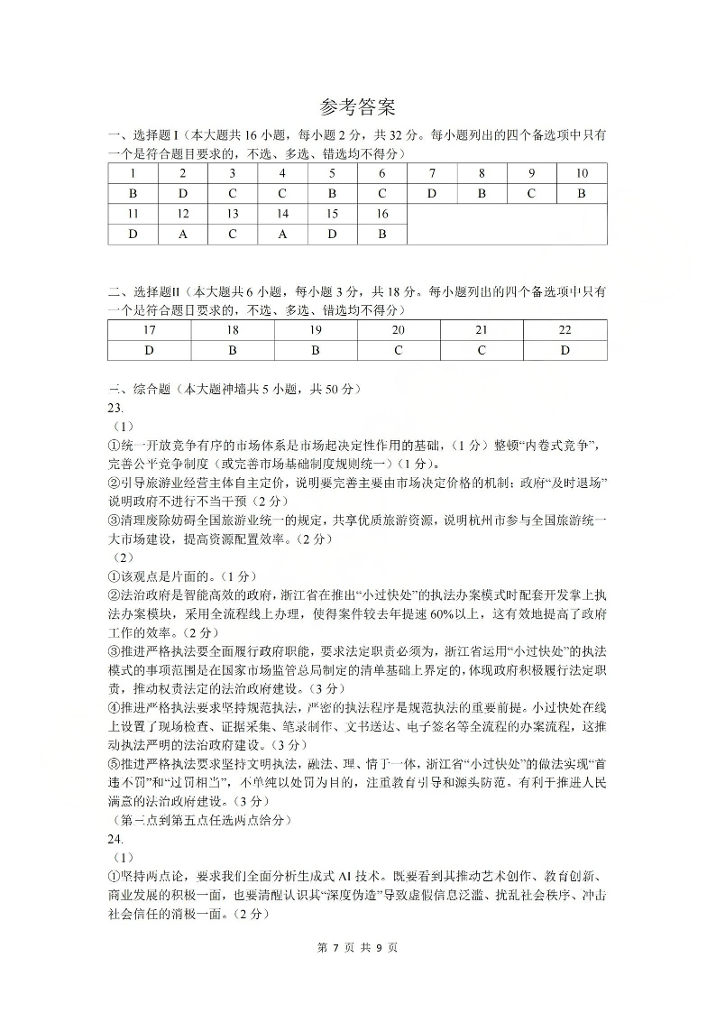 高三政治答案--浙江省杭州学军中学2026届高三上学期首考适应性考试