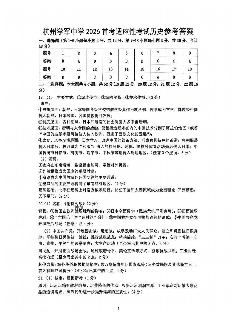 高三历史答案--浙江省杭州学军中学2026届高三上学期首考适应性考试
